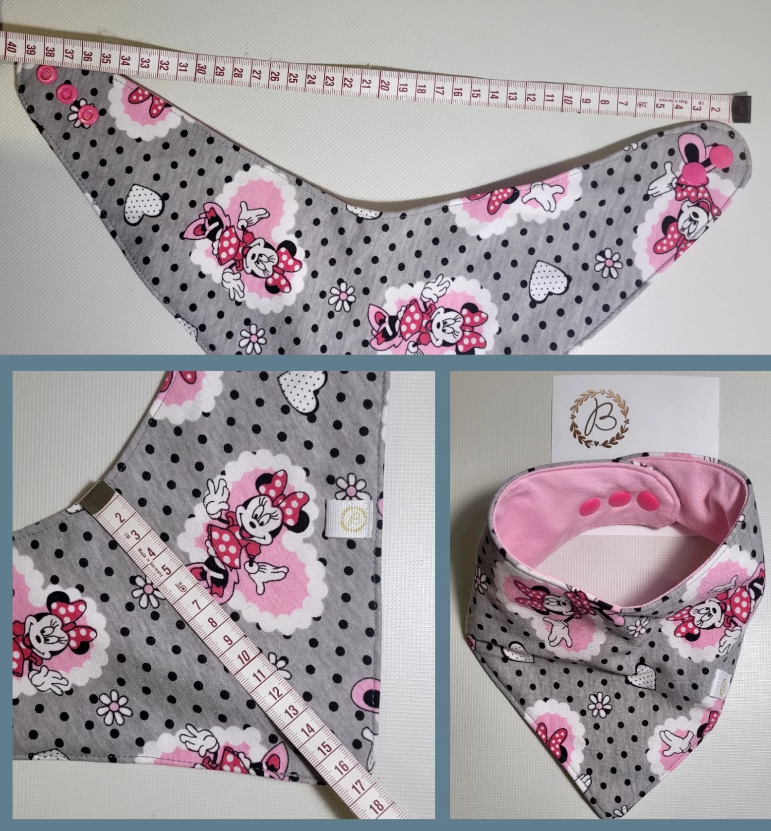 3 rétegből áll, alul és felül ökotex pamutjersey, közte 1 réteg pul, így vízhatlan. A 2 oldala más színű így ruházathoz megfelelően kiválasztható melyik látszódjon. A patentoknak köszönhetően 33 cm-től 43 cm-ig állítható, így sokáig hordható. 60 fokon mosható, közepes hőfokon vasalható.