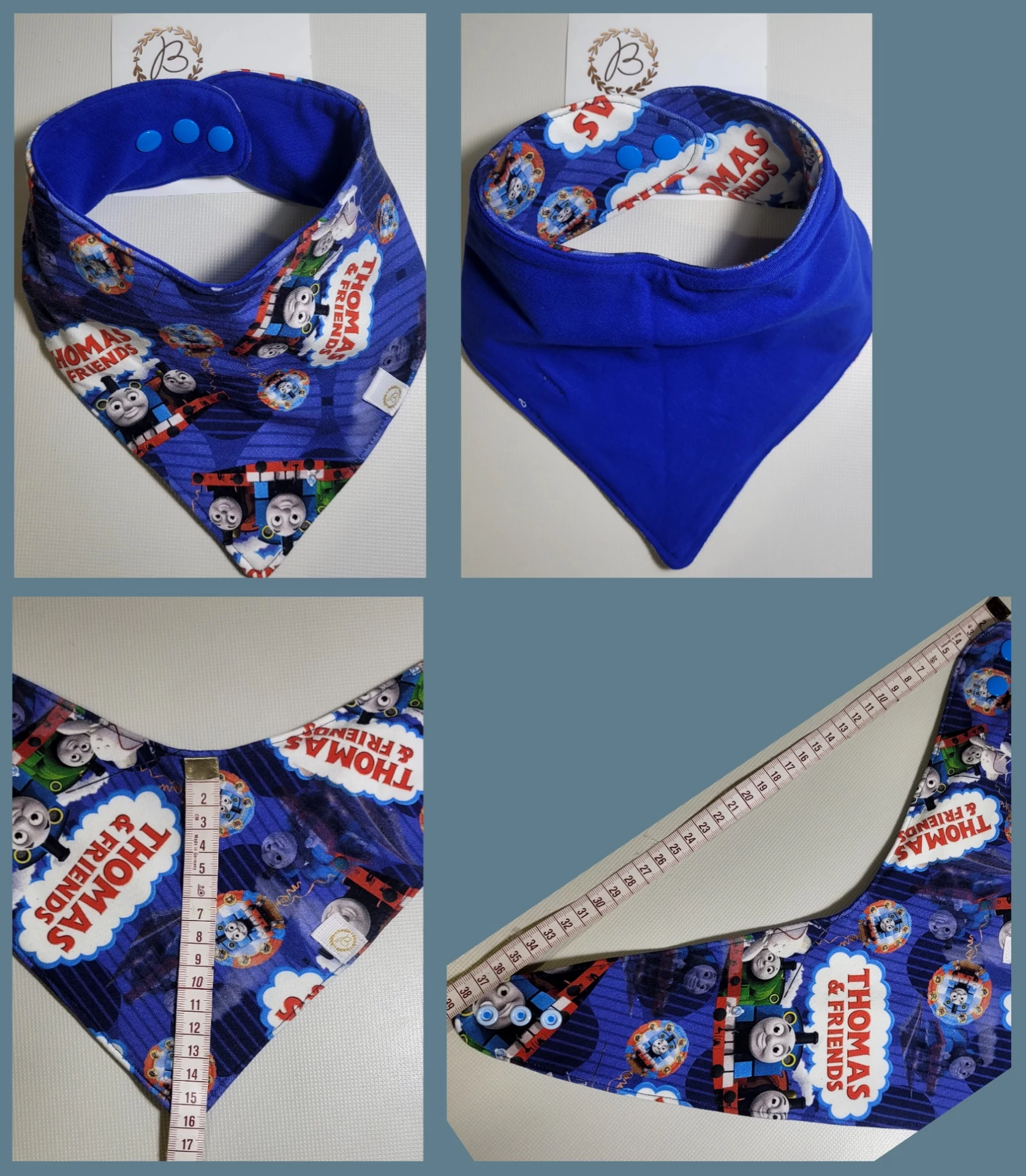 3 rétegből áll, alul és felül ökotex pamutjersey, közte 1 réteg pul, így vízhatlan. A 2 oldala más színű így ruházathoz megfelelően kiválasztható melyik látszódjon. A patentoknak köszönhetően 33 cm-től 43 cm-ig állítható, így sokáig hordható. 60 fokon mosható, közepes hőfokon vasalható.