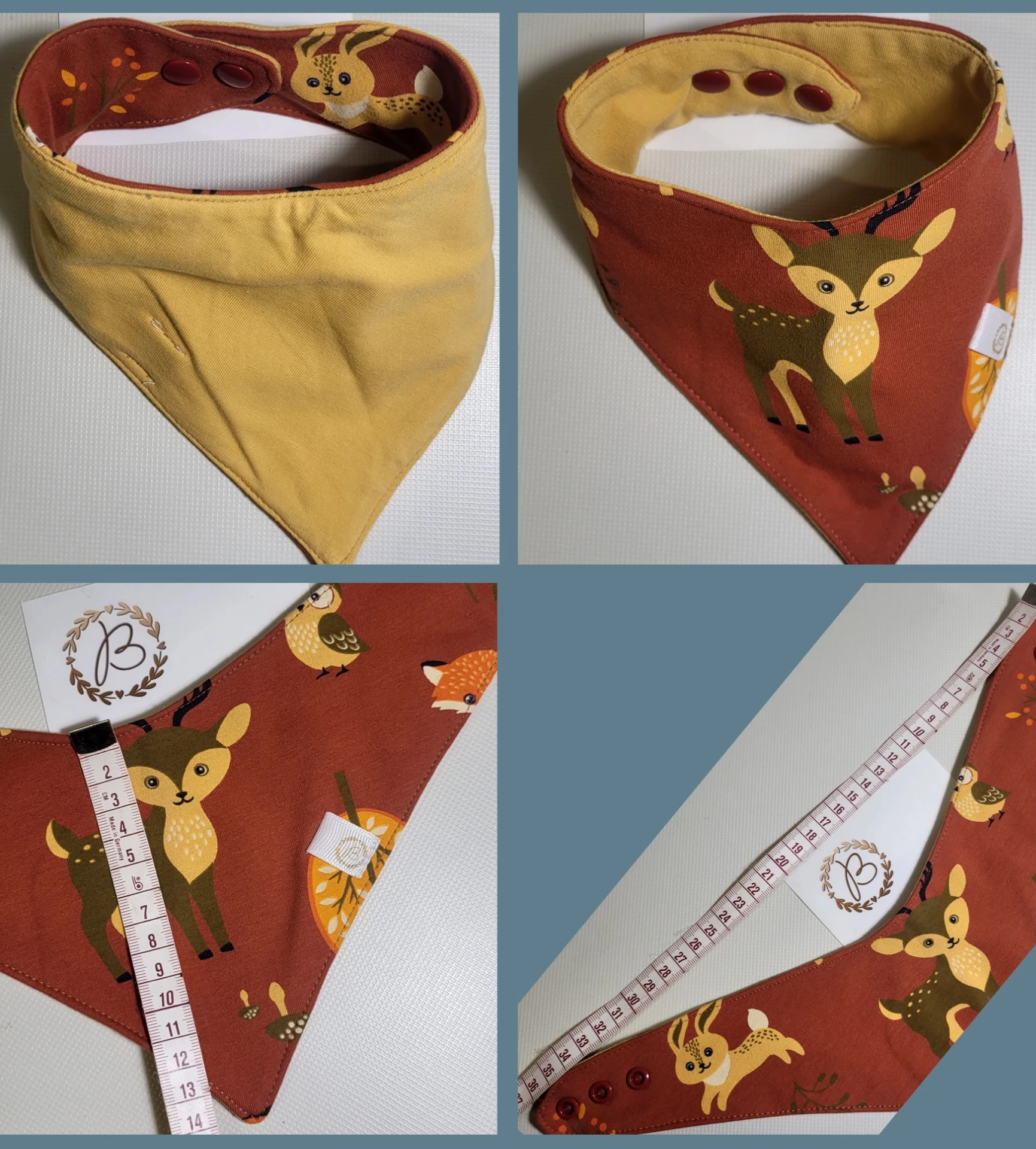 3 rétegből áll, alul és felül ökotex pamutjersey, közte 1 réteg pul, így vízhatlan. A 2 oldala más színű így ruházathoz megfelelően kiválasztható melyik látszódjon. A patentoknak köszönhetően 29 cm-től 37 cm-ig állítható, így sokáig hordható. 60 fokon mosható, közepes hőfokon vasalható.