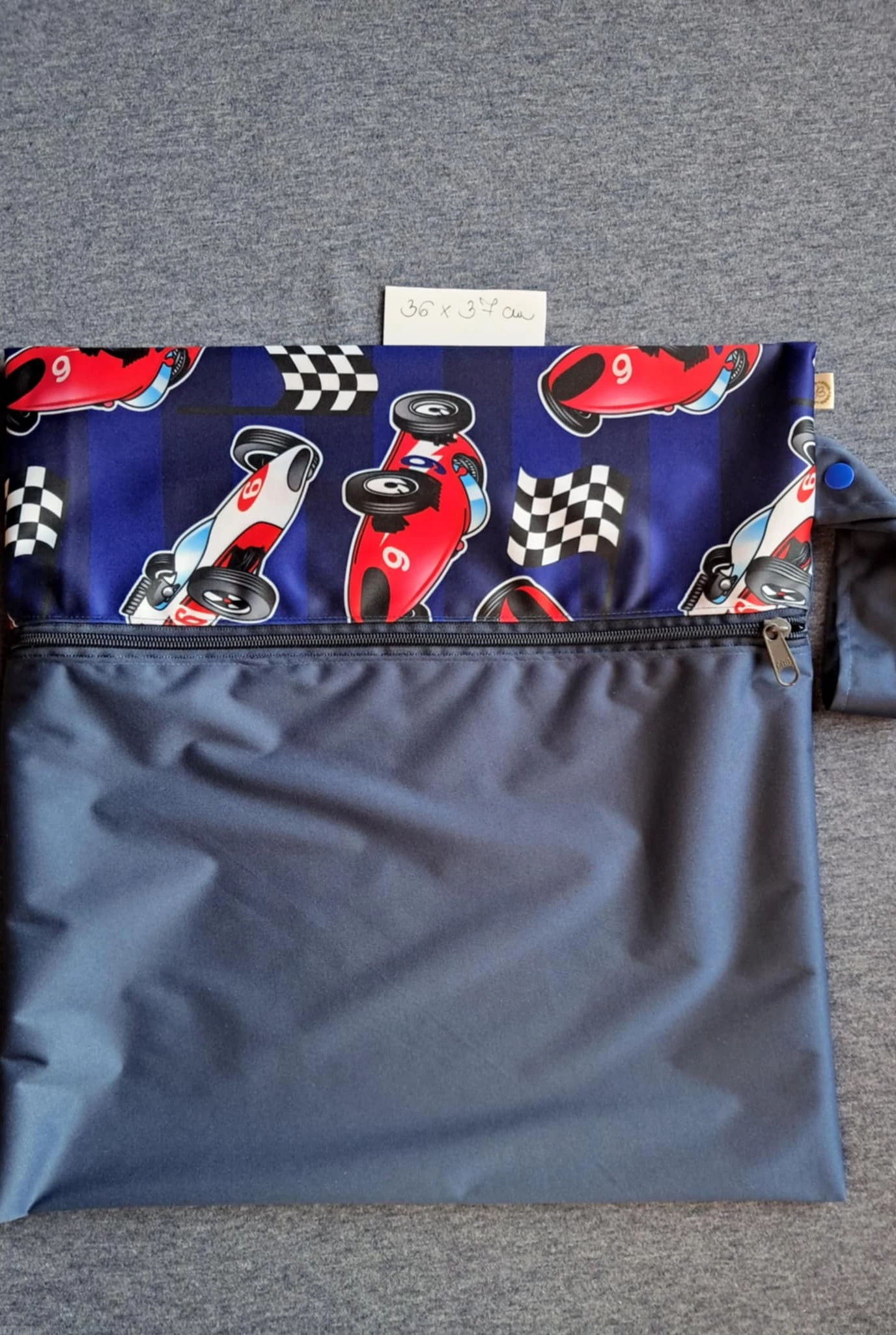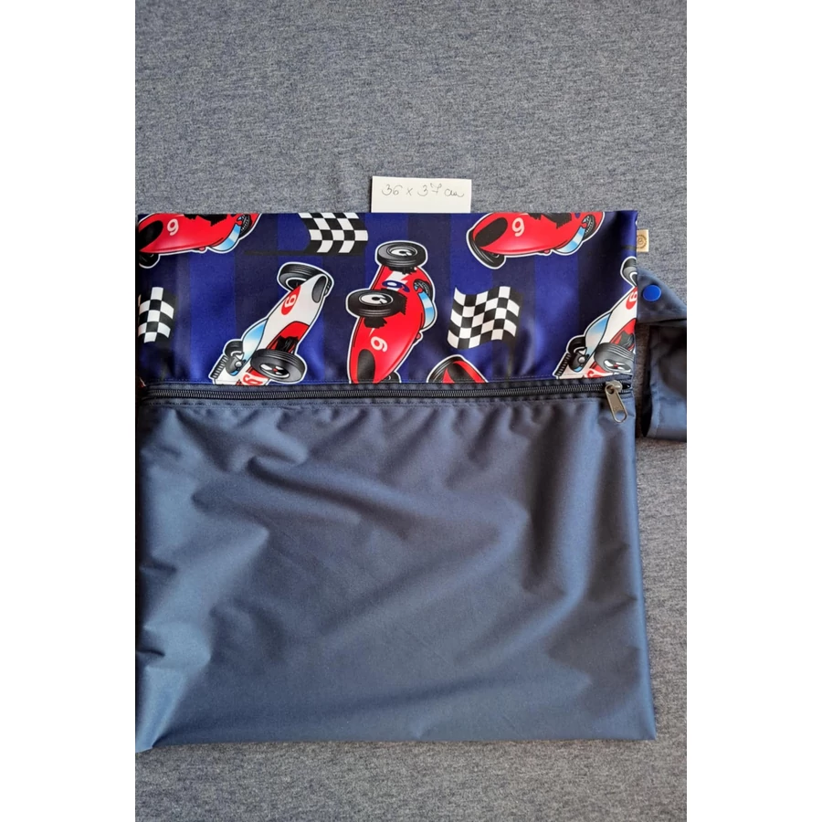 Mosható pelenkazsák- cipzáras, patentos füles-versenyautó+ sötétkék pul -nagy-36 cm x 37 cm